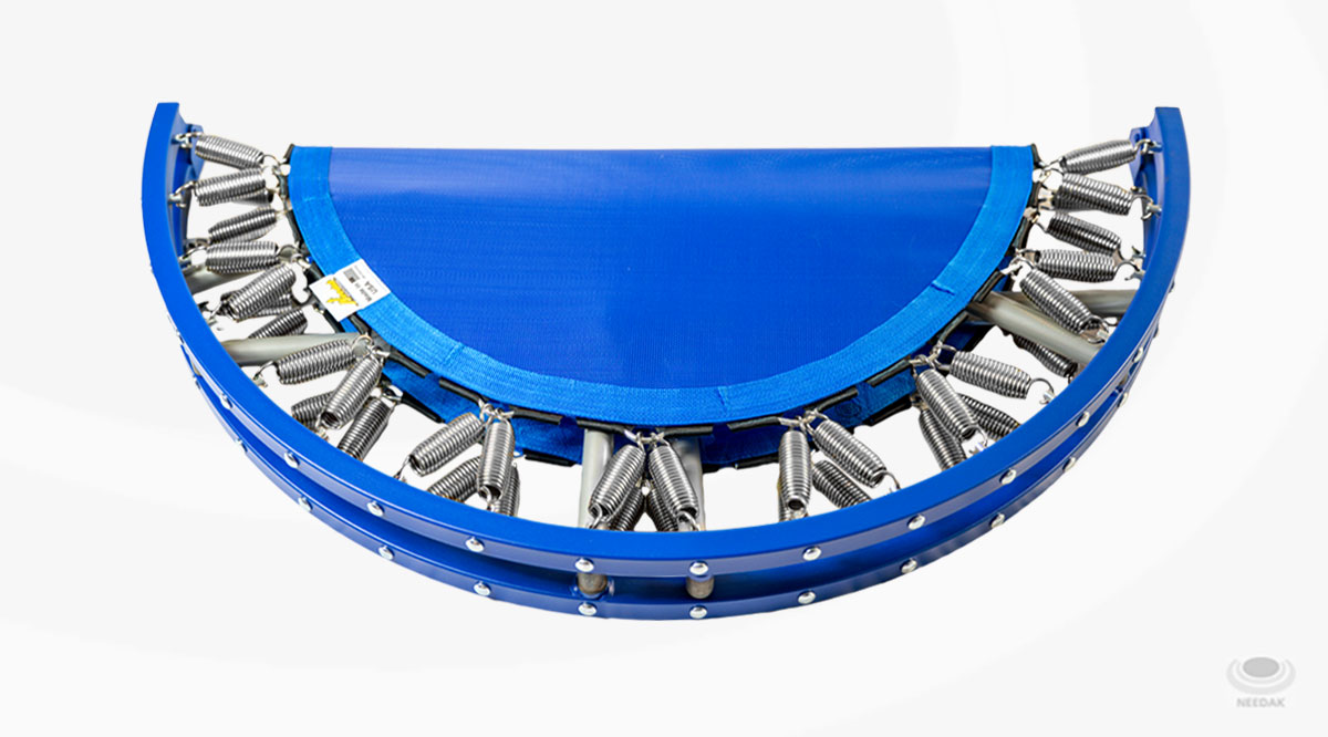 Please note that the new style of blue Needak Rebounder mats no longer have a silver band along the circumference. Durable Every Needak rebounder frame is made with heavy-grade steel coupled with thirty-six heavy duty spring mechanisms and custom-made jumbo springs. The Permatron® rebounder mat resists precipitation and sunlight which adds to this rebounders durability. Our spring systems use patented piano wire technology, are easy on the spine and knees, and do not cause proning. Soft-Bounce: Low Impact The patented Needak Soft-Bounce springs work to reduce the impact of each bounce by over 85%. This ensures that the user reaps the benefits of rebounding without putting unnatural strain on their knees and spine. Portable Fold your rebounder for easy storage or transport. Can easily fit in the trunk of a car, slide under your bed or be stored in your closet. Hard-Bounce vs Soft-Bounce The soft-bounce is our most popular seller, as it applies to the widest variety of users given that you can do both easy and intense workouts on it. The hard-bounce is slightly stiffer than the soft-bounce, and this provides more resistance for faster, harder workouts, and is also useful for individuals over 300lbs. Folding vs Non-Folding There is no difference between the folding and non-folding rebounders except for the ability for the folding to fold in half for storage and transport. Both are as stable and sturdy as each other, and come with the same limited lifetime warranty. Fully Assembled All our rebounders, be it hard or soft, folding or non-folding, come fully assembled and you can start bouncing right out of the box. The legs come flattened for packing, and the folding rebounder comes folded. Quiet, Relaxing Bounce Unmodified decibel sound test comparing the Needak Rebounder to various sounds. Even we were surprised by the results! Great for Canadian Winters Unlike summer months where a jog or walk through your local park can form part of your fitness routine, keeping up with exercise in winter is tougher and gym memberships can be expensive. With a Needak - all this changes. You can exercise anytime of the day in the comfort and warmth of your home. ISO Certified Materials We endeavor to use stable materials that do not degrade via outgassing. We also use non-toxic materials free of heavy metals and noxious airborne chemicals. All our materials are 100% sourced in the USA. For any questions regarding the safety of materials, don't hesitate to contact us. Specifications Our rebounders weigh approximately 26.5 Ibs (12KG). The box size of our folding rebounder is approximately 32 inches x 19.5 inches x 4 inches (100cmx50cmx10cm). The mat size is approximately 28 1/2 inches in diameter while the entire frame is 40 inches in diameter. Our rebounders are all approximately 10 inches in height with the legs fully extended. Limited Lifetime Warranty All our rebounders come with a limited lifetime warranty that ensures your purchase is both safe and reliable. Made in USA Proudly 100% made in Nebraska, USA. Component and manufacturing quality control is all localized, meaning no lead, no cheap parts, and no mis-configurations.